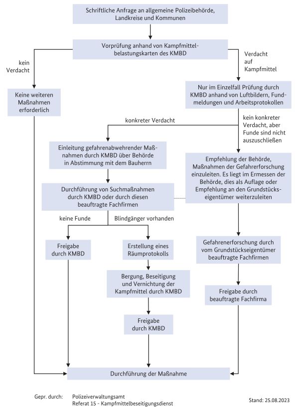 Danach obliegt die Kampfmittelbeseitigung als Aufgabe der Gefahrenabwehr den allgemeinen Polizeibehörden. Zu deren Unterstützung unterhält der Freistaat Sachsen beim Polizeiverwaltungsamt den Kampfmittelbeseitigungsdienst, der auf Ersuchen der allgemeinen Polizeibehörden in Amtshilfe tätig wird.