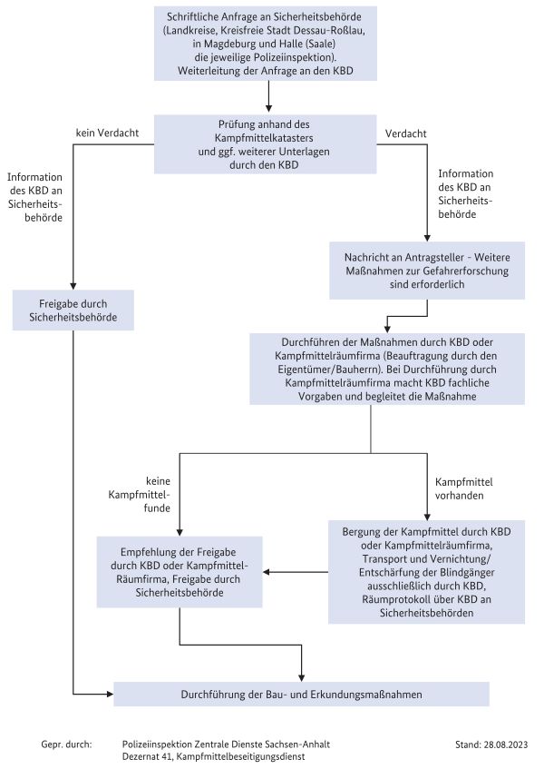 Die Kampfmittelbeseitigung ist eine Aufgabe der Gefahrenabwehr und obliegt grundsätzlich den örtlich zuständigen Sicherheitsbehörden. Dies sind die Landkreise, die kreisfreie Stadt Dessau-Roßlau und in Magdeburg sowie Halle die jeweilige Polizeiinspektion.