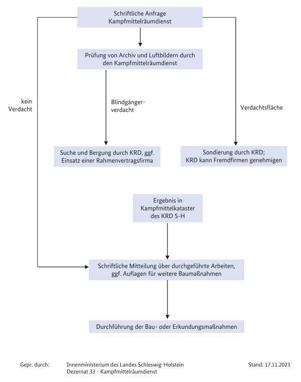 Der Kampfmittelräumdienst wird auf Antrag (des Grundstückseigentümers bzw. Nutzungsberechtigten), von Amts wegen tätig. Zu den originären Aufgaben des Kampfmittelräumdienstes Schleswig-Holstein (KRD SH) gehört die Gefährdungsabschätzung von Flächen mittels Auswertung historischer Daten (z. B. alliierte Kriegsluftbilder und weitere digitalisierte Archivdaten wie Fundmunitions- und Luftschutzpolizeimeldungen, Schadenspläne etc.). Darüber hinaus ist der Kampfmittelräumdienst für die Überprüfung von Kampfmittelverdachtsflächen mittels Sondiermaßnahmen zuständig. Diese Maßnahmen werden sowohl selbst (insbesondere Überprüfung von Bombenblindgängerhinweisen) als auch durch gewerbliche Vertreter der Kampfmittelräumung im Auftrag wahrgenommen. Alle Maßnahmen des KRD SH werden auf Grundlage der Landesverordnung über Verwaltungsgebühren abgerechnet. Die Beseitigung und Vernichtung der Kampfmittel wird ausschließlich vom Kampfmittelräumdienst mit eigenen Kräften durchgeführt.