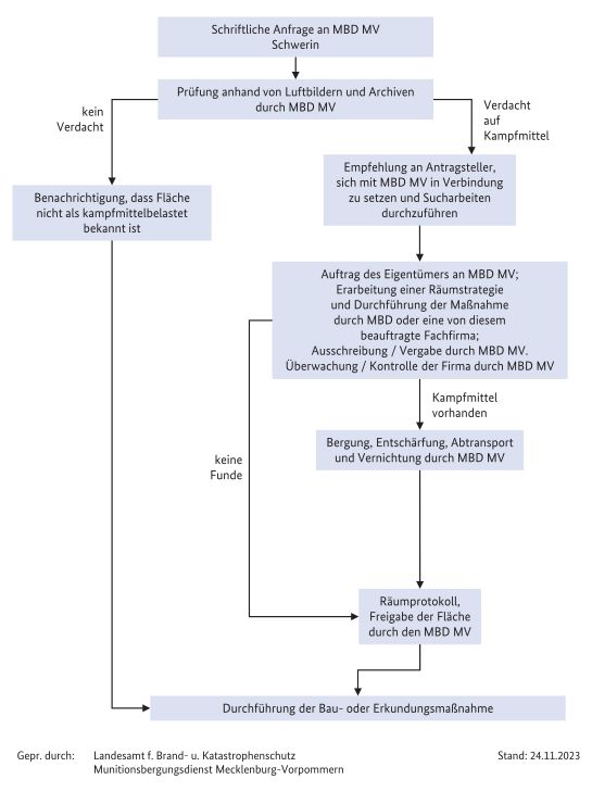 Für die Durchführung weiterer Maßnahmen muss der Grundstückseigentümer den MBD MV beauftragen. Hierzu zählt zum einen die Kampfmittelbelastungsanfrage (KMBA), bei der dem Anfragenden mitgeteilt wird, ob die betroffene Fläche als kampfmittelbelastet bekannt ist oder nicht. Die Auskunft ist gebührenpflichtig. Ab Januar 2024 besteht die Möglichkeit, eine KMBA online abzufragen, dieser Service ist kostenlos. Bei Kampfmittelverdacht können dann weitere Maßnahmen auf der Liegenschaft selbst beauftragt werden wie die Untersuchung, Sondierung, Freilegung, Bergung und Beseitigung von Kampfmitteln. Bei der Beauftragung von Fachfirmen erfolgt durch den MBD MV die „Fachaufsicht“ nach § 4 der KampfmV, d. h. die Überwachung und Kontrolle der durchgeführten Arbeiten sowie die Bestätigung der Kampfmittelfreiheit. Hierzu ist es erforderlich, dass der MBD MV vor Auftragsvergabe durch Dritte eine Überprüfung der Räumstrategie vornimmt und diese bestätigt.