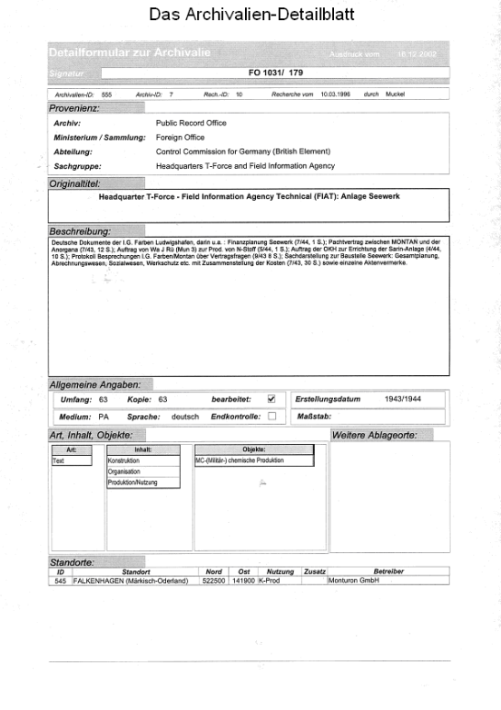 Die recherchierten Archivalien und deren Inhalte werden in der Datenbank mittels vorgegebener Eingabestruktur erfasst. Mit der Zuweisung der Bestände und der Einzelsignatur der Archivalien ist die zweifelsfreie Zuordnung zwischen Archivalienkopie und Aktenoriginal im Archiv gewährleistet, was insbesondere der Nachvollziehbarkeit und wissenschaftlichen Überprüfbarkeit der zitierten Quellen einerseits sowie der ordnungsgemäßen Dokumentation andererseits dient.