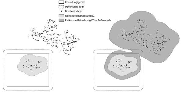 Im Falle des Verursachungsszenariums Luftangriffe kann auch ein mehr als 50 m vom Erkundungsgebiet entfernter Bombentrichterteppich auf Grund der Vielzahl an Bombentrichtern auf relativ geringer Fläche bei der Berechnung der Risikozonen mit der intensitätsbasierten Methode dazu führen, dass Teile des Erkundungsgebietes innerhalb der errechneten Risikozone 1 liegen und deshalb eine Kampfmittelbelastung dort als wahrscheinlich gilt.
