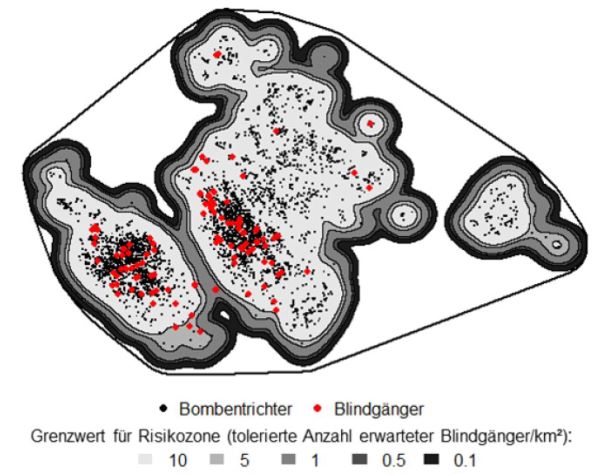 Auf Grundlage der beobachteten Sprengbombentrichter und einer Standardblindgängerquote von 15% wurden Risikozonen basierend auf fünf unterschiedlichen Grenzwerten der maximal tolerierbaren Anzahl zu erwartender Blindgängern (Cut-off-Werte) außerhalb der Risikozone berechnet. In Tabelle 1 werden die Fläche der resultierenden Risikozone, die modellbasierte Wahrscheinlichkeit für die Existenz von Blindgängern außerhalb der entsprechenden Zone (Sicherheitstoleranz), die tatsächliche Anzahl an Blindgängern außerhalb der Zone nach Gesamträumung des Gebietes und die Anzahl der im Luftbild beobachteten Sprengbombentrichter außerhalb der Zone dargestellt (Abb. 2 und Tab. 1 sowie erläuternder Text aus Günther et al. 2020).