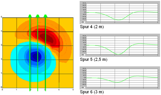 Abb. A-3.1-20: Auswertung einer Gradiometermessung zur Ortung einer Fliegerbombe auf einem Flugfeld (100 lb-Bombe, 1,5 m Tiefe, liegend).