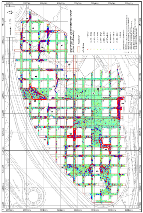 Abb. A-3.1-23 zeigt eine Übersichtskarte der Gradiometermessung. Dargestellt sind die Ergebnisse der oberen Sondenreihe. Aus Kosten- und Zeitgründen wurde nicht die gesamte Fläche untersucht, sondern eine streifenförmige Messung durchgeführt. Hierfür wurde ein rechtwinkliges Streifengitter in Nord-Süd- und Ost-West-Richtung gewählt. Die Streifenbreite betrug 12 m, um mögliche Störkörper in der Mitte des Streifens ohne Seiteneffekte in einer Tiefenlage von 5 - 6 m erkennen zu können. Der Abstand zwischen den Streifen betrug etwa 40 m.