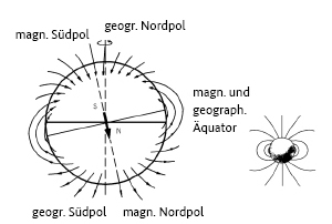 Überall auf der Erde gibt es ein natürliches Magnetfeld, das eine horizontal freibewegliche Magnetnadel (magnetischer Kompass) in die (magnetische) Nordrichtung einstellt. Ursache dafür ist, dass die Erde wie ein magnetischer Dipol wirkt und um sich ein eigenes Magnetfeld ausbildet. Der Dipol ist dabei nach Süden gerichtet, so dass unter einem Punkt in der Nähe des geographischen Nordpols ein magnetischer Südpol liegt. Der Grund für diese Sprachverwirrung liegt in der seit Alters her gebräuchlichen Bezeichnung „Nordpol“ für das Nordende der Kompassnadel. Man hätte es besser den nordsuchenden Pol nennen sollen.