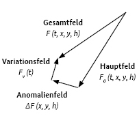 Das Magnetfeld ist ein Vektorfeld, d. h. es wird durch seine Totalintensität (Betrag) und seine Richtung beschrieben. Die Anteile des Gesamtmagnetfeldes (Hauptfeld, Variationsfeld und Anomalienfeld) addieren sich vektoriell (Abb. A-3.1-2).
