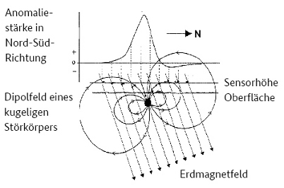 Die homogen magnetisierte Kugel dient als einfachstes Modell eines künstlichen Störkörpers (Bombe). Die Berechnung des dazugehörigen Anomaliefeldes zeigt, dass das Feld (Totalfeld) mit der dritten Potenz der Entfernung d abnimmt.