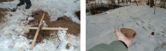Abb. A-3.1-37: Markierung einer Verdachtsstelle im Gelände auf Basis der elektromagnetischen Kartierung aus Abb. A-3.1 - 36, geborgenes Fundobjekt (SD1) (Fotos: Krummel)