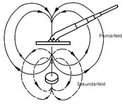 Beim Dämpfungsverfahren sendet man ein hochfrequentes magnetisches Feld (Primärfeld) geringer Leistung in den Erdboden. Dabei bildet sich infolge der entstehenden Wirbelströme vom metallischen Gegenstand ausgehend ein Sekundärfeld, das sich mit dem Primärfeld überlagert (Abb. A-3.1-25). Da es dem Primärfeld entgegengesetzt gerichtet und geringer ist, wird dieses abgeschwächt (gedämpft). Durch die elektronische Einrichtung des Gerätes wird die Abschwächung in ein akustisches Signal umgewandelt und gleichzeitig das Primärfeld so verstärkt, dass der Energieverlust kompensiert wird.