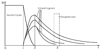 Der Verlauf des abfallenden Signals wird in der Pause zwischen zwei Impulsen durch ein bei verschiedenen Gerätetypen verschiebbares Abtastfenster (Zeitpunkt 3) gemessen und in einer elektronischen Schaltung ausgewertet. Neuere Geräte werten mehrere Zeitfenster (4 und mehr) aus und erfassen damit den gesamten Verlauf der Abklingkurve. Damit lässt sich eine optimale Auswertung der Daten erreichen.