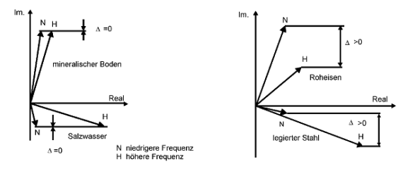 Auch das Zweifrequenzverfahren nutzt die Möglichkeit der Induktion von Wirbelströmen in einem elektrisch leitfähigen Störkörper aus. Bei diesem Verfahren wird ein aus drei Spulen bestehendes Spulensystem benutzt: eine konzentrische Primärspule sowie zwei halbkreisförmige Sekundärspulen (Spulenhälften). Die Primärspule sendet kontinuierlich ein Signal aus zwei unterschiedlich hohen, speziell ausgesuchten Frequenzen aus. Durch die Induktionswirkung im Störkörper und deren Rückwirkung auf das Spulensystem ändert sich der Scheinwiderstand (Impedanz) der Spule (Abb. A-3.1-27). Scheinwiderstände setzen sich aus einem Real- und einem Imaginärteil zusammen. Die Imaginärteile der Scheinwiderstände differieren bei den verwendeten Frequenzen für alle elektrisch leitfähigen Materialien so stark, dass sie zu einer Auswertung herangezogen werden können. Dagegen ist der Unterschied der Imaginärteile der Scheinwiderstände von elektrisch schwächer leitfähigen Materialien (z. B. metallhaltige Böden oder auch Salzwasser) äußerst gering. Eventuell doch vorhandene Differenzen können durch elektronische Phasenverschiebungen zusätzlich unterdrückt werden.