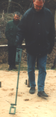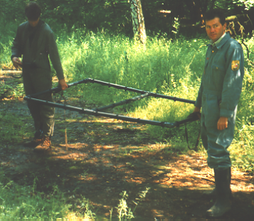 In Abb. A-3.1-28 ist schematisch ein tief eindringender Metalldetektor dargestellt (Knödel et al., 1997). Die fest montierten, getrennten Sende- und Empfangsspulen sind horizontal angeordnet (vertikaler magnetischer Dipol) und liegen direkt aufeinander (Coincident loop). Der Spulendurchmesser beträgt 1 m. Die Messelektronik ist tragbar. Gemessen wird die Induktionsspannung in der Empfangsspule. Die Messwerte werden zugleich akustisch und als Zahlenwert angezeigt sowie digital registriert, damit sie zur Verarbeitung an einen Kleincomputer weitergeleitet werden können. Es kann eine 2. Empfangsspule 40 cm oberhalb der Sende- und Empfangsspulen angebracht werden. Sie dient der Messwertaufnahme in einem 2. Abstand zum Untersuchungsobjekt. Zwei unterschiedliche Messhöhen ermöglichen eine bessere Tiefenabschätzung von detektierten Objekten und den Nachweis von oberflächennahen störenden Metallteilen.