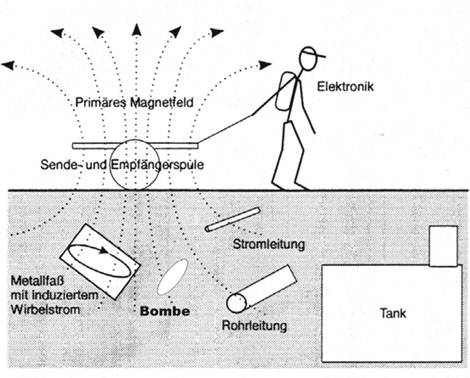 Abb. A-3.1-28: Schematische Funktionsweise und typische Untersuchungsobjekte des tiefeindringenden Metalldetektors (entnommen und modifiziert aus Knödel et al., 1997).