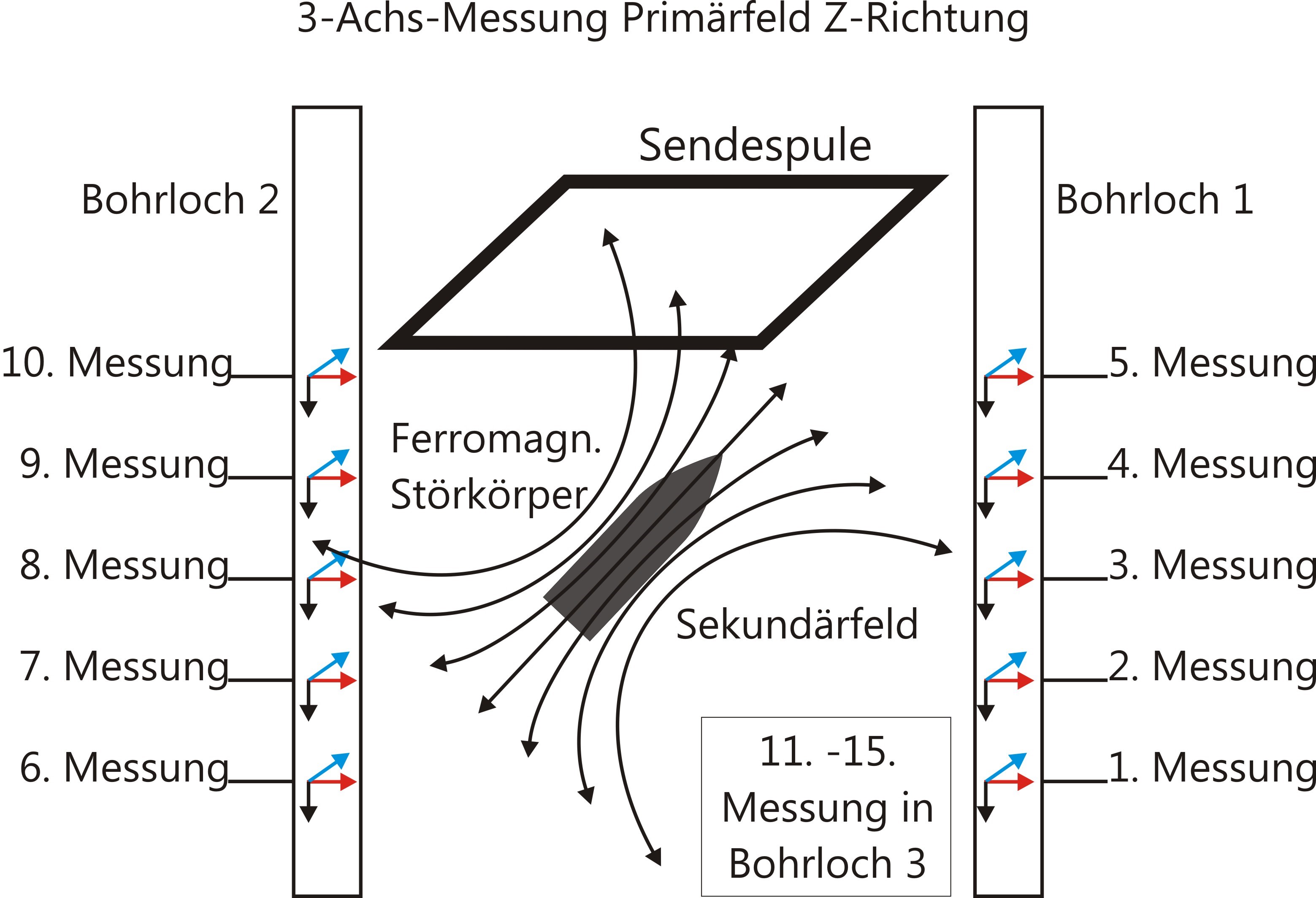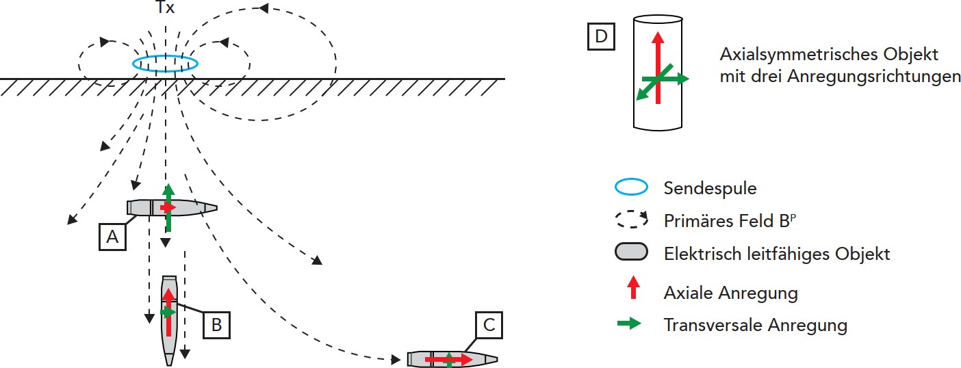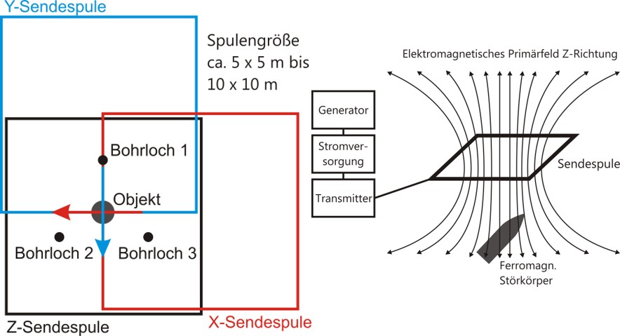 Durch das von der Sendespule angelegte elektromagnetische Primärfeld wird im ferromagnetischen Objekt im Untergrund ein Wirbelstrom induziert, der seinerseits ein sekundäres Magnetfeld erzeugt, welches mittels 3-Achs-Magnetometer in den Bohrlöchern erfasst wird.