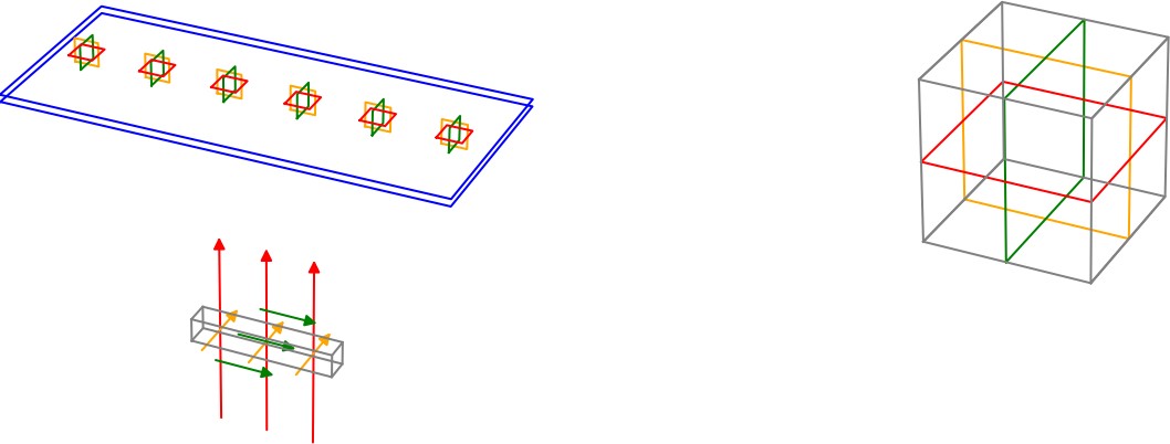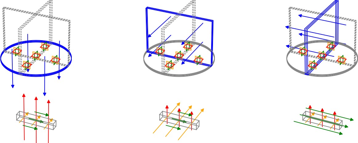 Abb. A-3.1-41: Schematische Skizze eines stationären Messsystems. Anregung mit unterschiedlichen Transmitterspulen (blau: Z/links, Y/mitte, X/rechts). Ohne das Gerät neu zu positionieren, ist es möglich, ein Objekt im Untergrund aus drei verschiedenen Raumrichtungen (X, Y, Z) anzuregen. Je nach Ausrichtung des sich im Untergrund befindlichen Objektes werden dabei entweder die transversalen Eigenschaften (rot/links und orange/mitte) oder die axialen Eigenschaften (grün, rechts) stärker angeregt (Abb.: Stascheit GmbH).