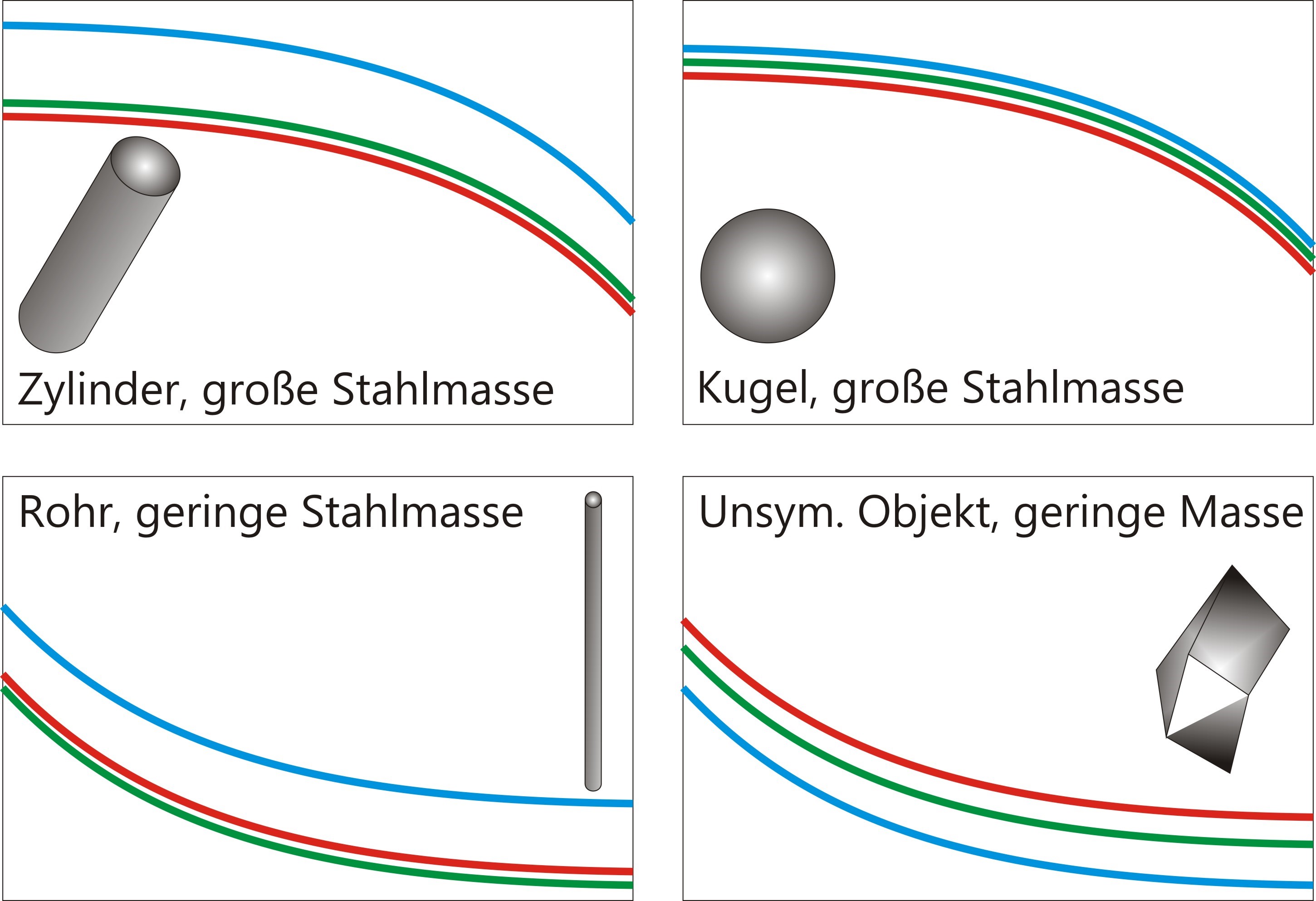 Die folgende Abbildung zeigt schematisch die Polarisierbarkeiten unterschiedlicher ferromagnetischer Objekte. Es werden darin im Vergleich die Signaturverläufe für einen Zylinder und eine Kugel mit großer Masse und ein Rohr und ein unsymmetrisches Objekt mit geringer Masse gezeigt.