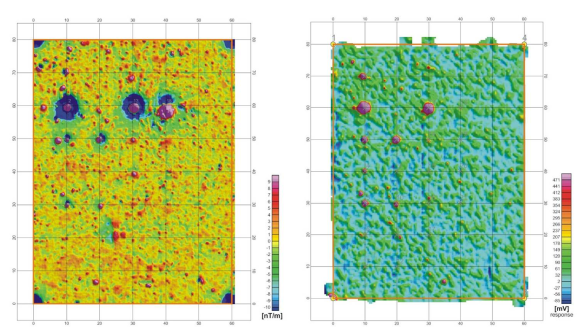 Abb. A-3.1-38: Ergebnis vergleichender Messungen mit Magnetik und Elektromagnetik. Das linke Bild zeigt die Auswertung einer Magnetik-Messung (Gradiometer) mit der Ferex-Sonde der Fa. Förster und das rechte Bild eine elektromagnetische Messung mit dem EM 61 von Geonics (Messung und Auswertung: geoFact GmbH).