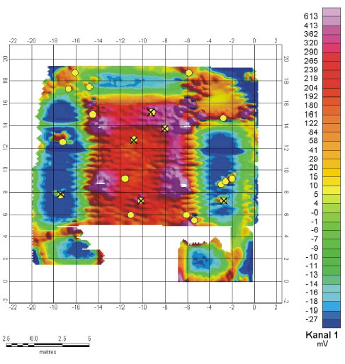 Die Auswertung der Magnetik ergab keine brauchbaren Ergebnisse. Aufgrund der Stahlbewehrung und des unterirdischen Blitzschutzsystems ist das Anomalienbild sehr unruhig und daher nicht interpretierbar.