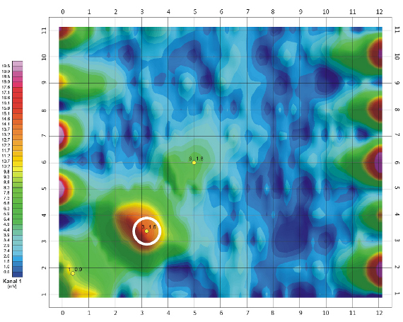 Mit der Elektromagnetik werden zusätzlich zu den Fe-Metallen auch Nichteisenmetalle detektiert, wobei hier die Einflüsse des natürlichen Untergrunds schwächer sind. Die Erkundungstiefe ist deutlich geringer als die der Magnetik. Die Messungen werden deutlich weniger als bei der Magnetik von seitlichen Störkörpern beeinflusst, woraus eine höhere laterale Auflösung auch von kleinen Objekten resultiert. In der Abbildung ist gut erkennbar, dass mit der Elektromagnetik eine lagegenaue, präzise und gut abgegrenzte Darstellung auch von kleineren Testkörpern erzielt wird.