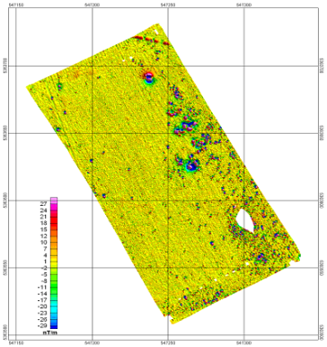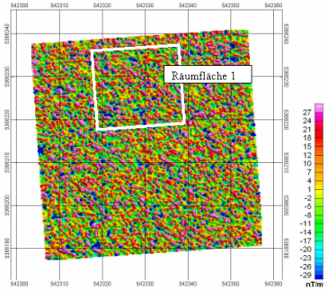 Detektiert wurden mittels Magnetik auf einer Fläche von 0,25 ha rund 3.800 Störpunkte. Der modellierte Tiefenschwerpunkt der zugehörigen Störkörper lag bei 0,1 m.