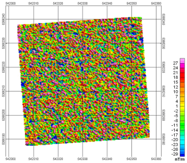 Detektiert wurden bei diesem Testfeld in einer ungleichmäßigen Verteilung 565 Störpunkte. Der modellierte Tiefenschwerpunkt der zugehörigen Störkörper lag bei 0,3 m. Eine gleichmäßige ferromagnetische Störkörperverteilung zeigt die folgende Abbildung (Abb. A-3.2-4):