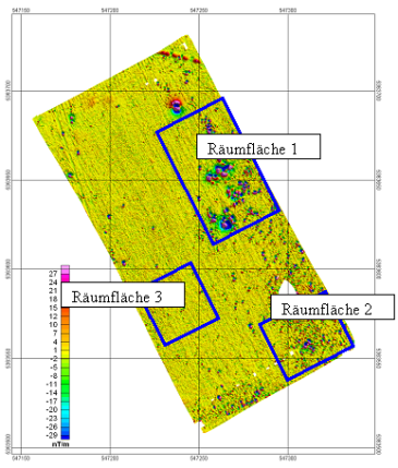 Auf Grundlage der geophysikalischen Ergebnisse werden Anzahl und Lage der Räumflächen innerhalb des Testfeldes geplant. Dabei gilt der Grundsatz, mit möglichst wenig Räumflächen ein hohes Maß an Aussagesicherheit zu erzielen. Dies geschieht vor dem Hintergrund, dass das Räumergebnis für das Testfeld repräsentativ sein muss. Anhand der vorherigen Abbildungen (Abb. A-3.2-3 und -4) wird der Prozess der Räumflächenauswahl erläutert.