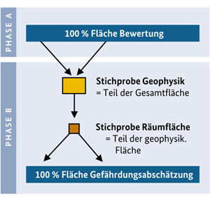 Hierzu wird an ausgewählten Flächen das Gelände geophysikalisch erkundet und im Anschluss eine Räumung durchgeführt. Damit wird das tatsächliche Kampfmittelinventar in Qualität und Quantität so bestimmt, dass die Ergebnisse repräsentativ für das Erkundungsgebiet gelten.