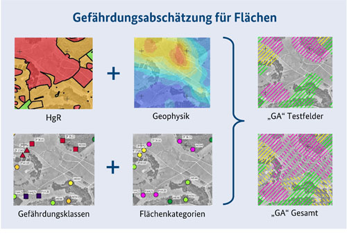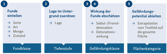 Die Gefährdungsabschätzung untersucht die kombinatorischen Wirkungen der Aspekte Kampfmittel, Detonationswahrscheinlichkeit, Detonationswirkung und die Nutzung.