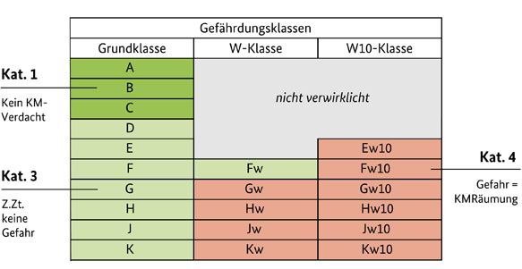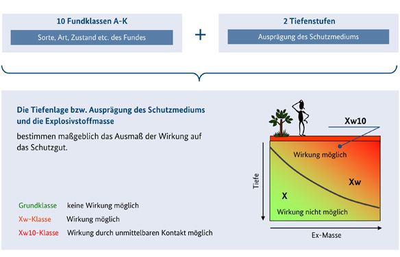 3. Durch die Kombination der Fundklassen mit den Tiefenstufen, der derzeitigen oder zukünftigen Nutzung und den jeweiligen Eigenschaften der Kampfmittel (insbesondere Möglichkeiten der Detonation sowie Explosivstoffinventar) wird die Wirkung im Schadensfall auf die Schutzgüter bestimmt. Die Funde werden in die Gefährdungsklassen eingestuft.