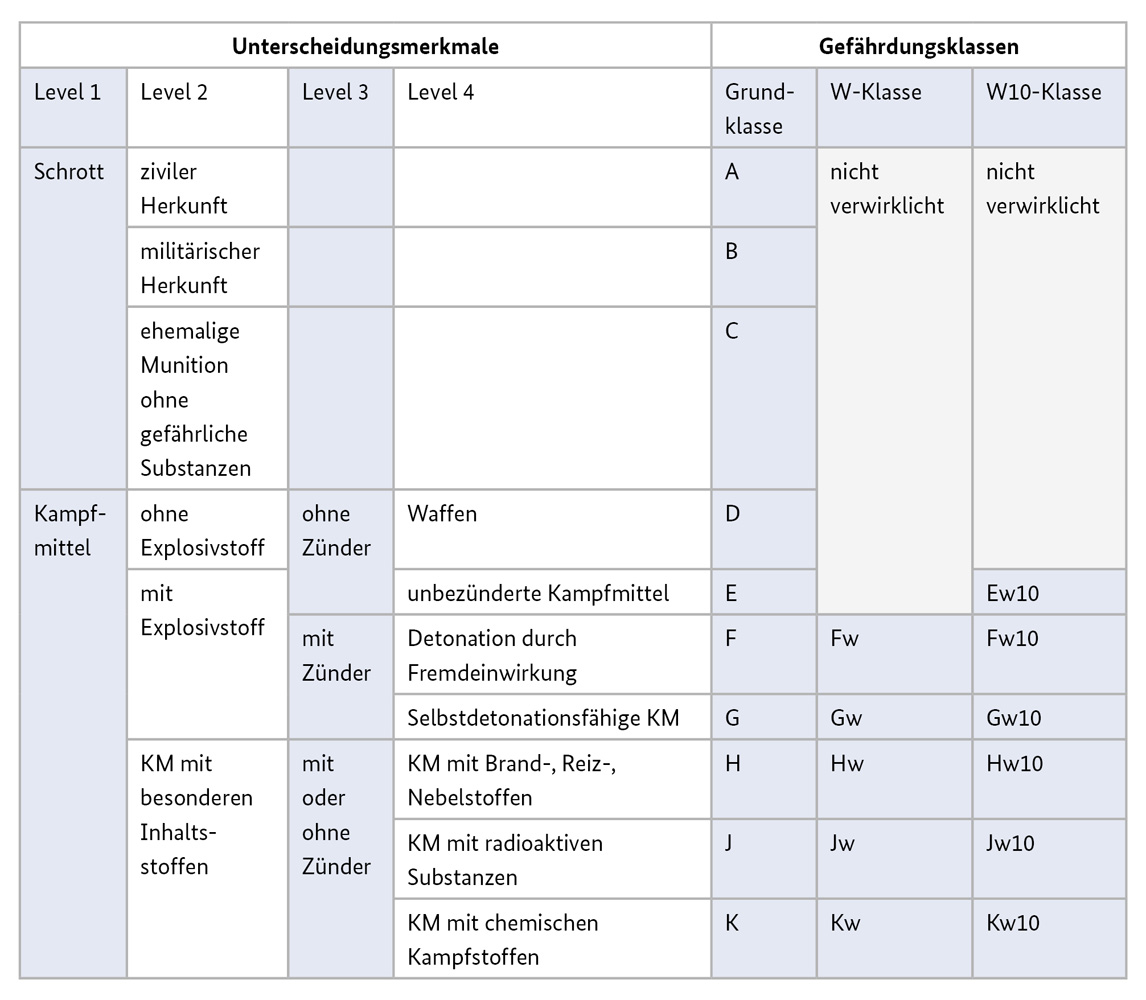 Die heutigen technischen Möglichkeiten der Kampfmittelräumung führen dazu, dass sehr unterschiedliche Gegenstände bei Kampfmittelräumungen gefunden werden. Die Spanne reicht von zivilem Schrott (Getränkedose oder Stahlseil) bis zu kampfstoffhaltigen Kampfmitteln. Um eine einheitliche Benennung und Bewertung vornehmen zu können, werden die Funde in 10 Fundklassen eingestuft. Hierfür sind alle Funde eindeutig zu identifizieren. Die Fundklassen werden mit den Großbuchstaben A bis K gekennzeichnet. Um Verwechselungen zu vermeiden, wurde der Buchstabe „I“ nicht vergeben.