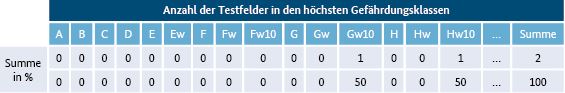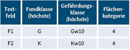In der zusammenfassenden Tabelle (Tab. A-3.3-5) werden die höchsten Fund- und Gefährdungsklassen und die daraus resultierende Flächenkategorie für jedes Testfeld dokumentiert.