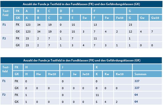 Die festgestellten Funde, die daraus abgeleiteten Fund- und Gefährdungsklassen sowie die Flächenkategorien sind übersichtlich tabellarisch und kartografisch darzustellen. Hierbei erfolgt in der Regel die Darstellung der Fundklassen, der Gefährdungsklassen und der Flächenkategorien für jedes Testfeld getrennt und in einer zusammenfassenden Darstellung für das Erkundungsgebiet.