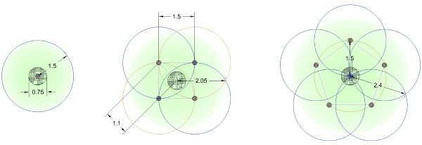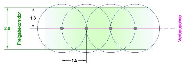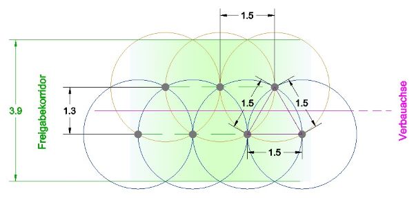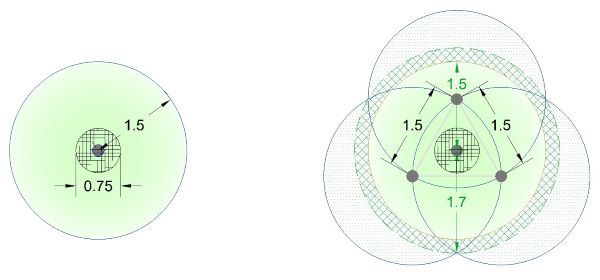 Beispiel für die Anordnung der Bohrlochsondierungen für die punktuelle Untersuchung (z.B. für Ramm- oder Bohrpfähle, hier mit einem Durchmesser von 0,75 m) Links: eine Bohrlochsondierung im Zentrum mit einem resultierenden Freigaberadius von 1,5 m. Rechts: drei Bohrlochsondierungen im Tripel mit einem Abstand von 1,5 mit dem kleinsten gemeinsamen Freigaberadius von 1,7 m (schraffierte Fläche) und der maximalen, unregelmäßig ausgebildeten Freigabefläche um jede Untersuchungsstelle (punktiert).