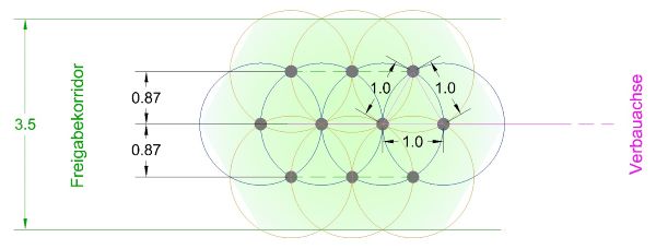 Bohrraster bei ungünstigen Standortverhältnissen mit drei Bohrlochreihen und einem für diesen (Beispiel-)Fall berechneten Bohrlochabstand von 1,0 m.