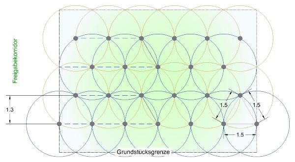 Anordnung der Ansatzstellen bei einer flächenhaften Erkundung mit dem für diesen Beispielfall berechneten Bohrlochabstand von 1,5 m