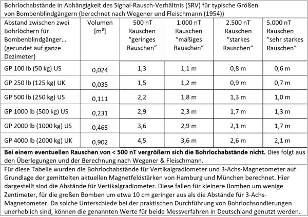 Für Bereiche mit geringem, mäßigem, starkem und sehr starkem Rauschen ist mit Bohrlochabständen in folgenden Größenordnungen zu rechnen (Berechnungsbeispiele, die für Vertikalgradiometer und 3-Achs-Magnetometer genutzt werden können):