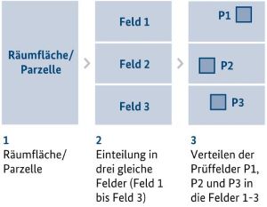 Die Räumfläche oder die Parzelle wird bei Vorgabe von n Prüffeldern vorab in n gleiche Flächeneinheiten unterteilt. In diese Einheiten wird anschließend je ein Prüffeld gelegt.