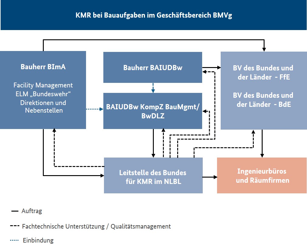 (6) Die Abteilung Infrastruktur des Bundesamtes für Infrastruktur, Umweltschutz und Dienstleistungen der Bundeswehr (BAIUDBw) ist für die Koordination der Kampfmittelräumung in den von der Bundeswehr genutzten Liegenschaften verantwortlich. Die Bearbeitung erfolgt in den regional zuständigen Kompetenzzentren für Baumanagement (BAIUDBw KompZ BauMgmt), Referate K 1 und 2 (Bauprojektmanagement) des BAIUDBw, unterstützt durch die Bundeswehr-Dienstleistungszentren (BwDLZ) auf Ortsebene. Die KompZ BauMgmt K 1 und 2 des BAIUDBw entscheiden über die Durchführung von Kampfmittelräumungen im Rahmen der militärischen investiven Baumaßnahmen. Die KompZ BauMgmt K 4 stellen die notwendigen Haushaltsmittel zur Verfügung (s. Abb. 3). Für Maßnahmen des Bauunterhalts entscheiden die KompZ BauMgmt K 1 und K 2 über die Durchführung und die BwDLZ stellen die benötigten Haushaltsmittel aus Kapitel 1408 Titel 519 11 zur Verfügung.